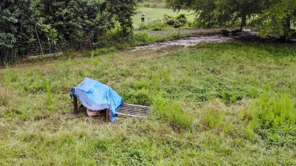 Hurricane Isaias didn’t affect the farm much. Instead, a brief but thunderous outpouring occurred just after the sun went down. Knowing the three sows were pregnant, I went out to check on them when the thunder had subsided. Sure enough, the stress incurred by the thunderstorm had induced the first sow’s birth — ‘Loin’s first litter! Three separate farrowing enclosures had been built but we had not gotten the girls inside in time. Loin was exhausted, breathing heavy, and nursing nine piglets. I built a makeshift canopy to protect Loin and the little ones through the night.